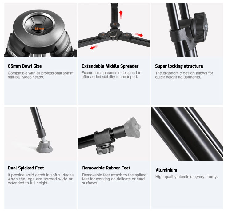 Dual-stage aluminum tripod legs with 65mm bowl base