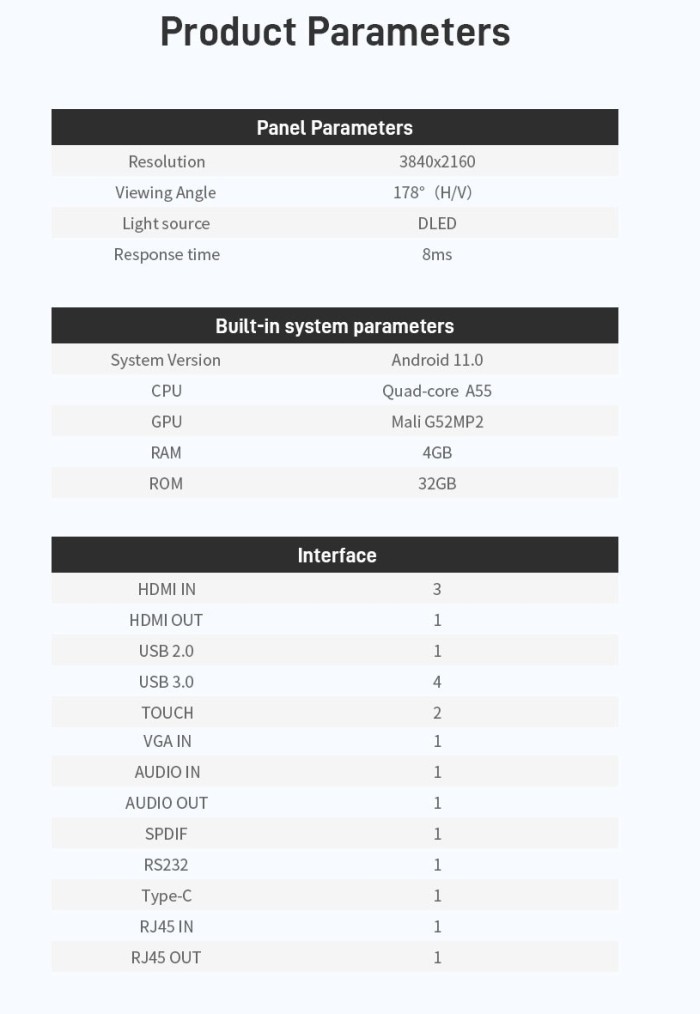 – Resolution : 3840*2160 (4K) with AG 3mm Temperred Glass