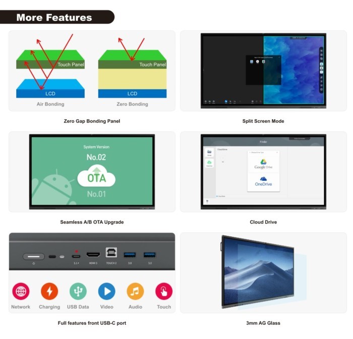 – Accesories Included: 1 Power Cable, 1 HDMI Cable, 1 Touch Cable, 2 Stylus Pen, 1 Wifi module, 1 Remote Control, 1 User Manual, 1 Wall Bracket,